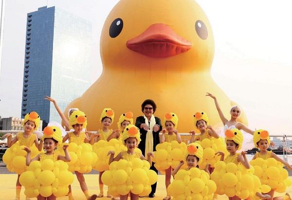 時至今日,這隻鴨從約莫10乘10公分,放大數百倍,像似被哆啦A夢的放大燈照了照,成了巨型大鴨。有趣的是,可愛的模樣不變,一樣亮晶晶的大眼,橙黃黃的身軀;不變的是,現在從0歲的小嬰兒到99歲的阿公阿嬤,都愛上了她,在全球刮起了一陣巨無霸的「鴨風」,頓時間,每個國家,每個人種,都想要一親鴨澤。